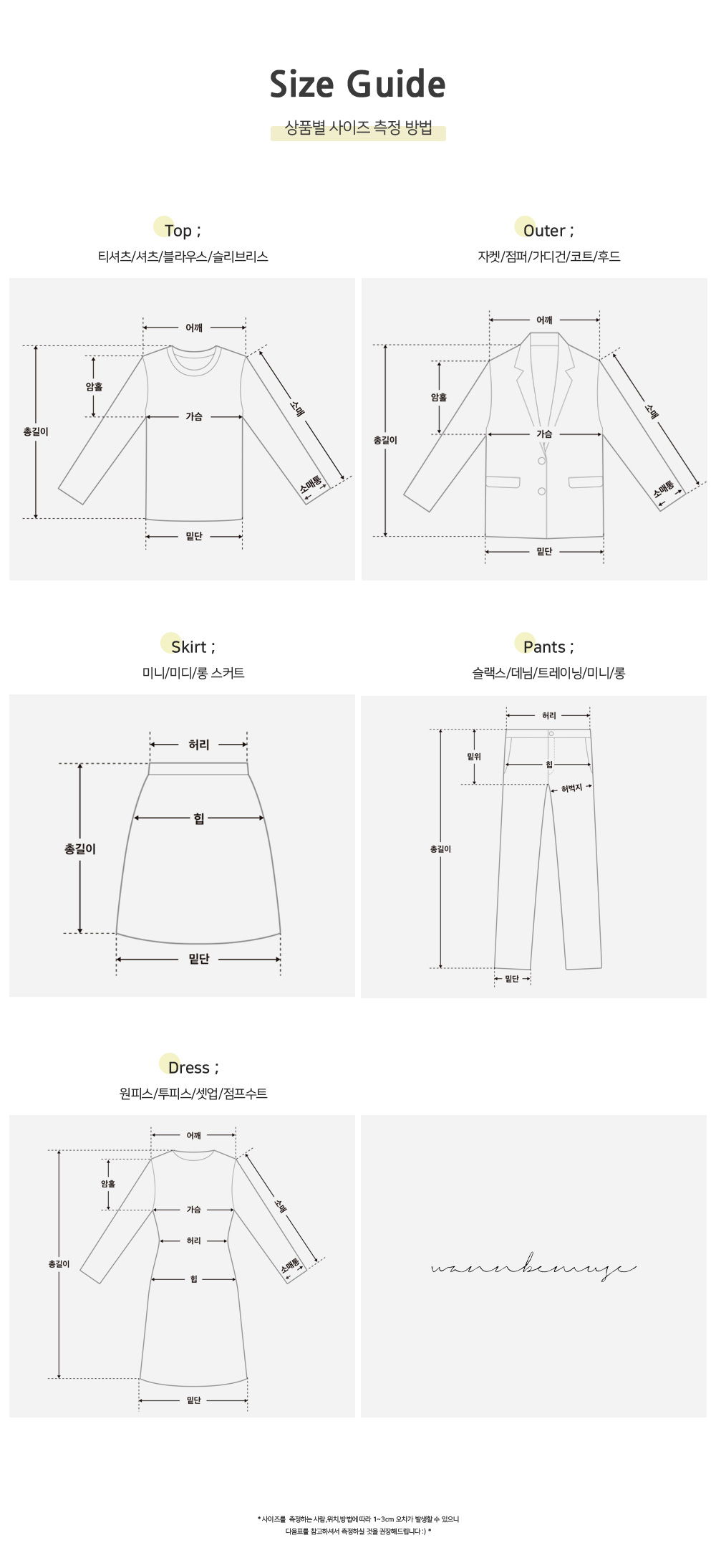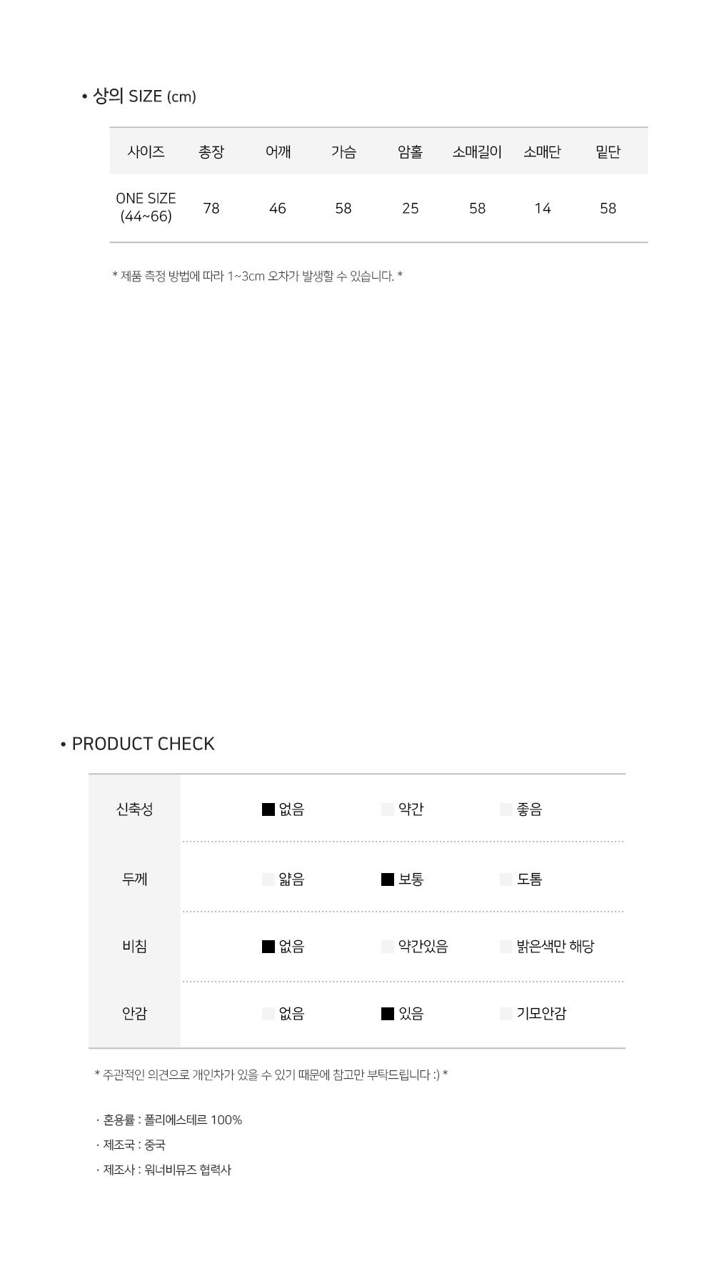 | Measurements are made with the garment laid flat. (The size may differ by 1~3cm) | ||||||