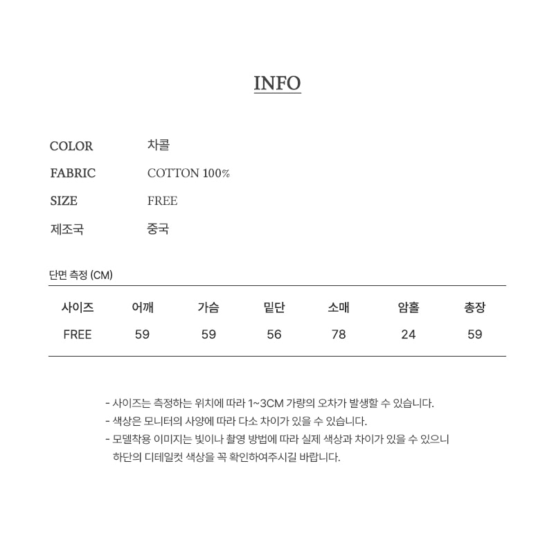 | Measurements are made with the garment laid flat. (The size may differ by 1~3cm) | ||||||