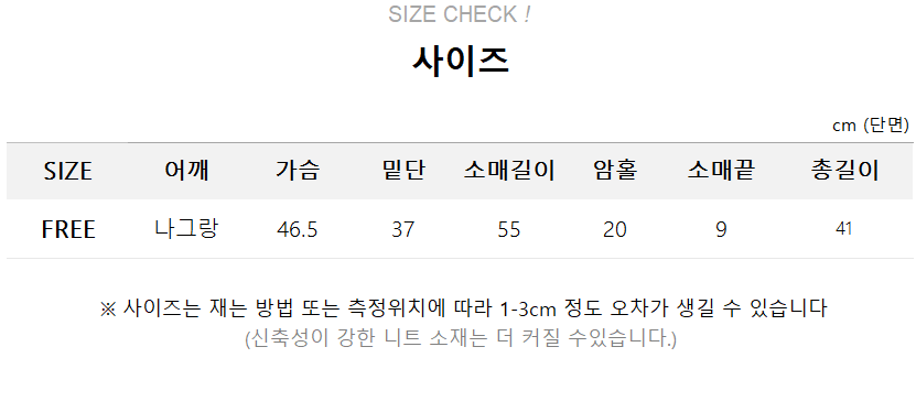 | Measurements are made with the garment laid flat. (The size may differ by 1~3cm) | ||||||